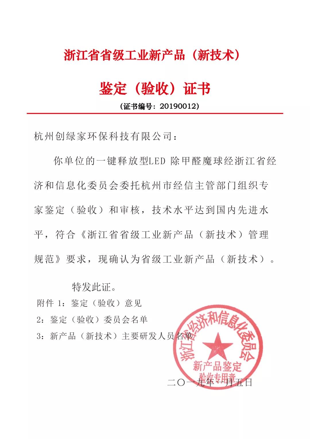創綠家環保旗下明星產品搖一搖除甲醛魔球經浙江省經濟和信息化委員會委托杭州市經信主管部門組織專家鑒定(驗收)和審核,技術水平達到國內先進水平,符合《浙江省省級工業新產品(新技術)管理規范》要求,現確認為省級工業新產品(新技術)。