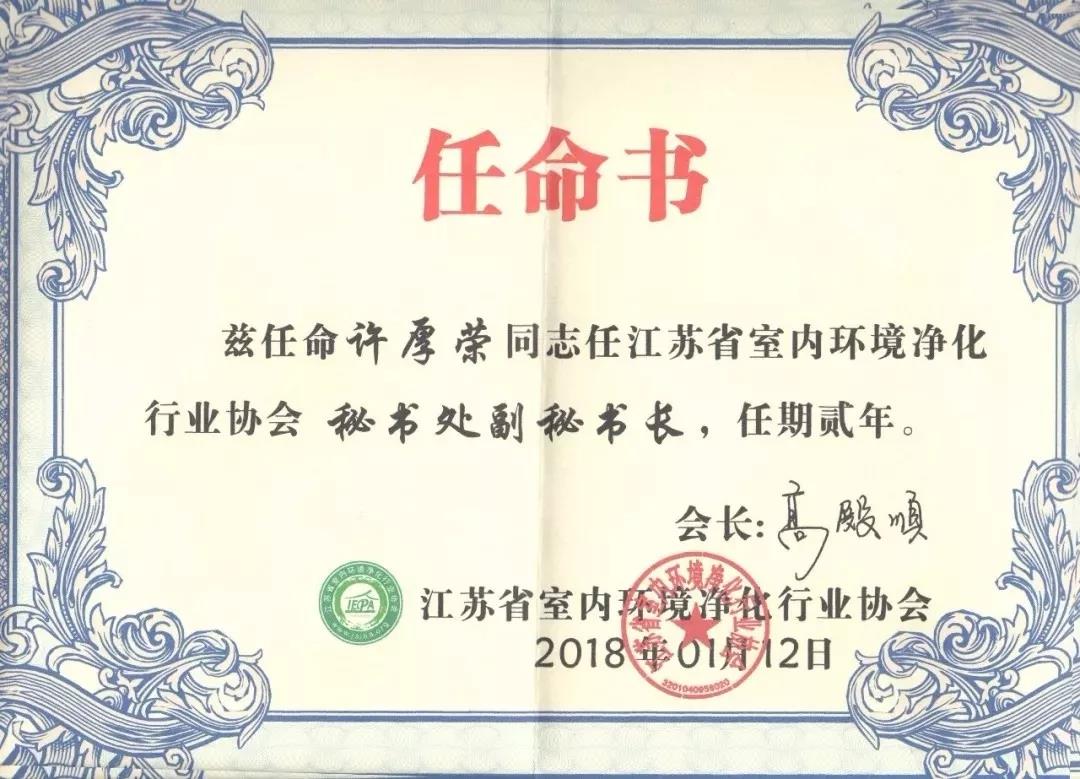 2018年1月13日,“中國室內環境凈化行業協會聯盟”與“江蘇省室內環境凈化行業協會”聯合舉辦的首屆“中國室內環保行業創新創優、融合發展”高峰技術年會在中國南京召開。協會隆重表彰了2017年度行業“突出貢獻獎”——許厚榮,任命其為江蘇省室內環境凈化行業協會秘書處副秘書長。