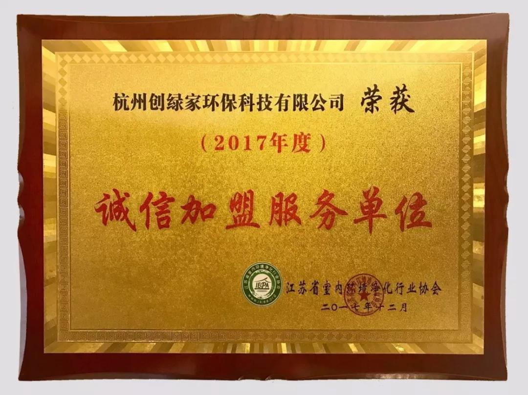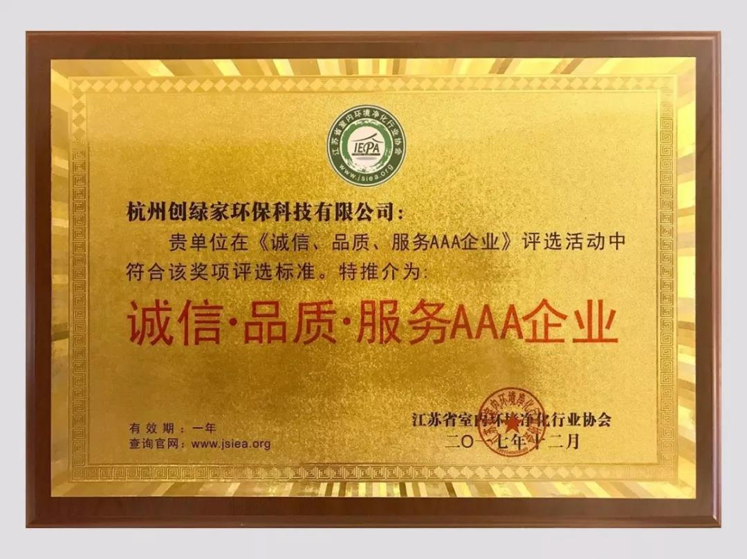 2018年1月13日,“中國室內環境凈化行業協會聯盟”與“江蘇省室內環境凈化行業協會”聯合舉辦的首屆“中國室內環保行業創新創優、融合發展”高峰技術年會在中國南京召開,我司榮獲誠信加盟服務單位、“誠信、品質、服務”AAA企業、示范工程獎、科技創新產品獎等多項榮譽。