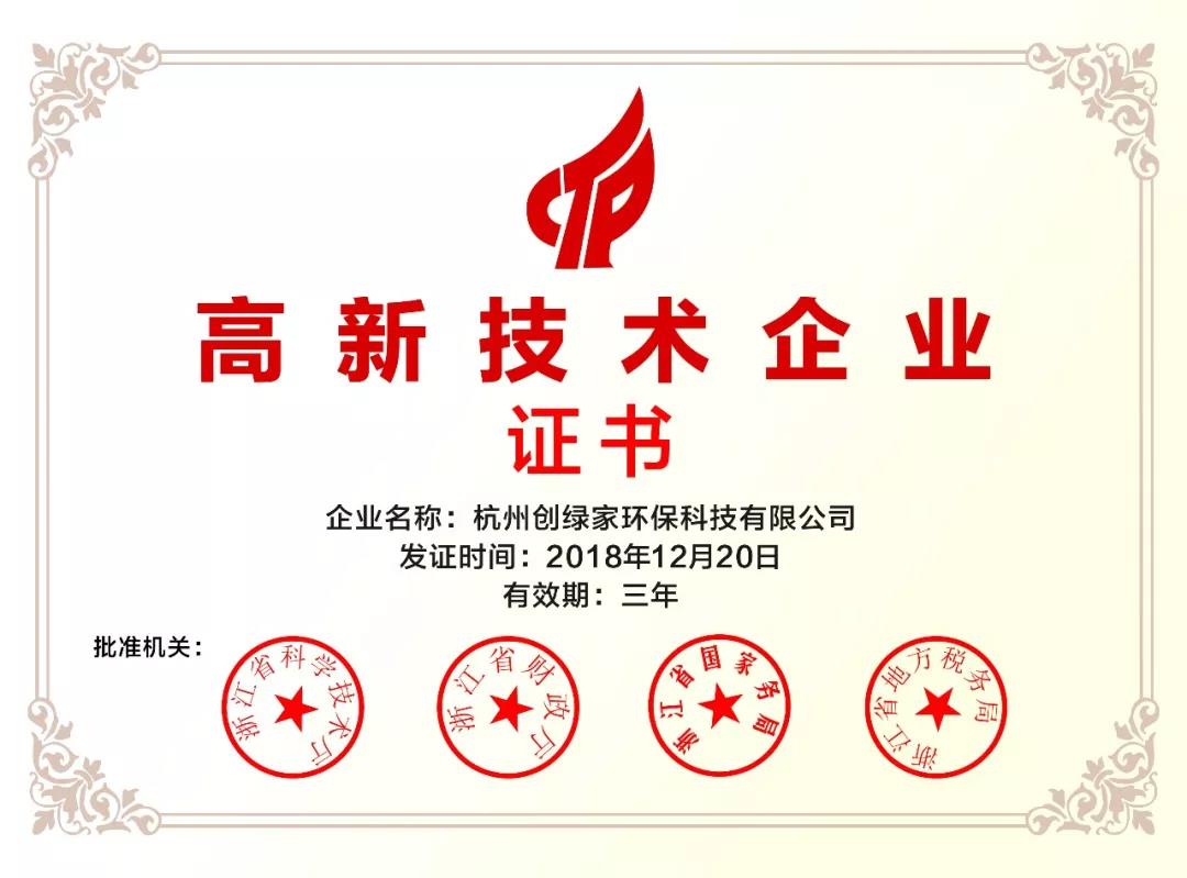 2018年12月,杭州創綠家環保科技有限公司被認定為國家高新技術企業。