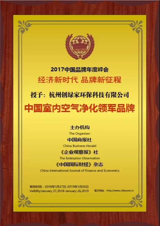 2018年1月26日-28日,由中國商報社、《企業觀察報》社和《中國國際財經》雜志聯合主辦的“2017中國品牌年度峰會”在京隆重舉行。杭州創綠家環保科技有限公司榮獲“中國室內空氣凈化領軍品牌”殊榮。