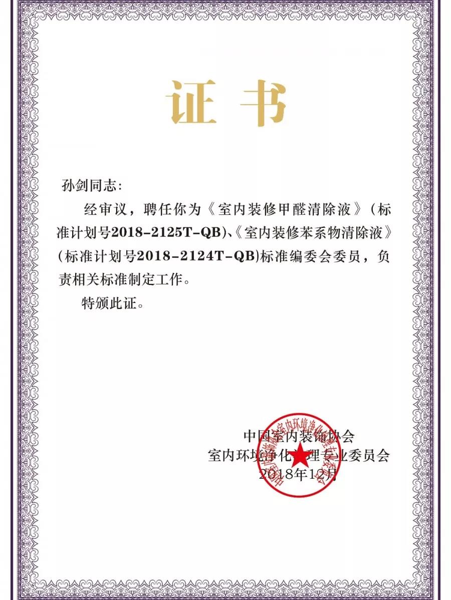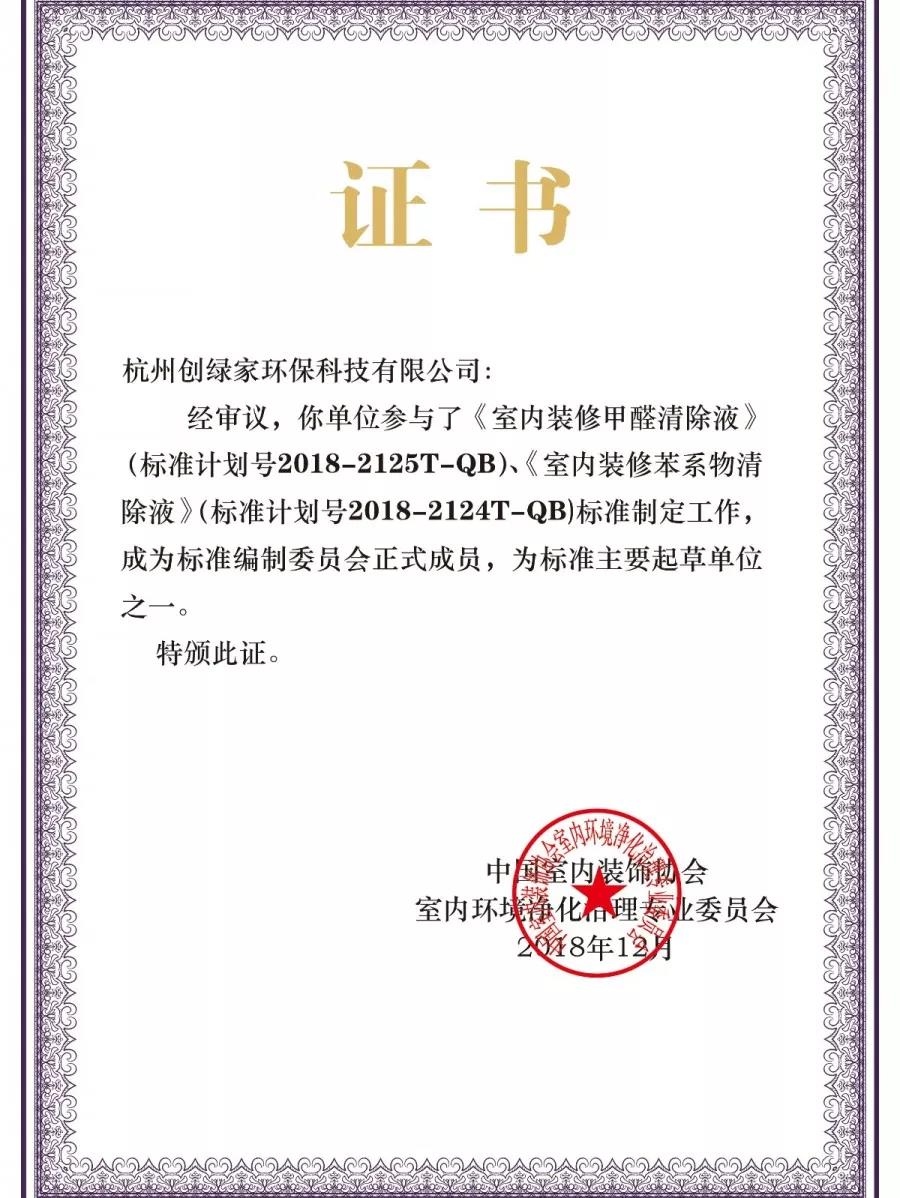 2018年12月19日,中國室內環境凈化治理行業第五屆技術創新分享會在北京新聞大廈長安發布廳舉行。創綠家環保成為《室內裝修甲醛清除液》、《室內裝修苯系物清除液》標準內編制委員會正式成員,為標準主要起草單應之一,創綠家環保總裁孫劍被聘任為該標準編委會委員。