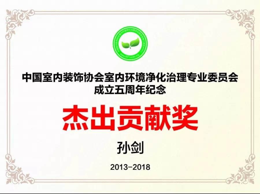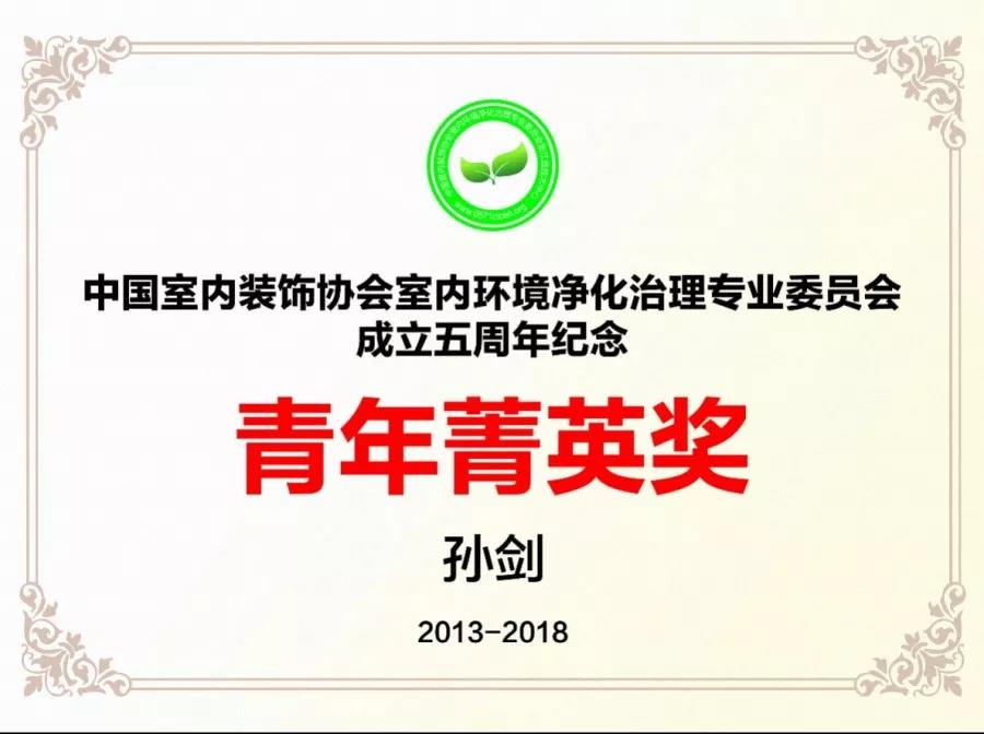 2018年12月19日,中國室內環境凈化治理行業第五屆技術創新分享會在北京新聞大廈長安發布廳舉行。創綠家環保總裁孫劍榮獲凈化委成立5周年杰出貢獻獎和青年菁英獎。